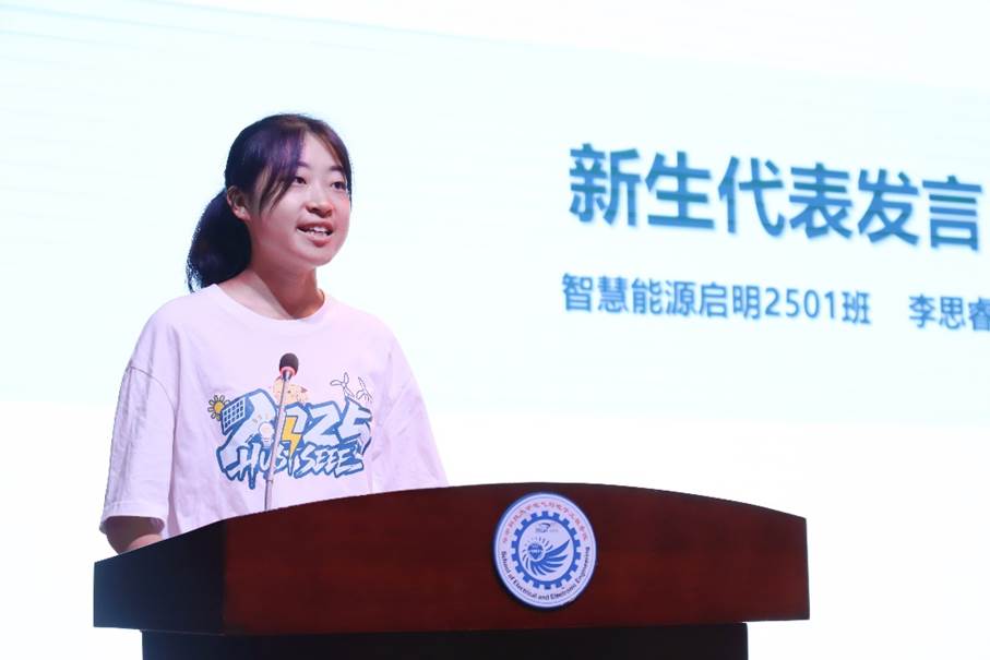 智慧能源启明2501班李思睿同学作为新生代表发言,她分享了自己选择华科电气的初心,并表示将与全体新生一道,以“板凳要坐十年冷”的定力钻研专业知识,以“敢教日月换新天”的锐气投身科创实践,努力将个人理想融入国家发展的大局。