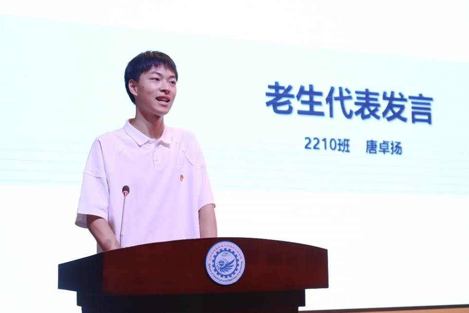 本科2210班唐卓扬同学作为老生代表发言,他从 “森林大学” 的独特视角,向新生们描绘了大学生活的丰富图景,分享了自己在电工基地成长、在答辩汇报中进步的经历。他鼓励新生们敢于走出寝室、尝试新事物,在探索中学会辨别风险、直面挫折,同时传承NT动漫 “一届带一届、一代帮一代”的温暖传统,在互助中共同成长。