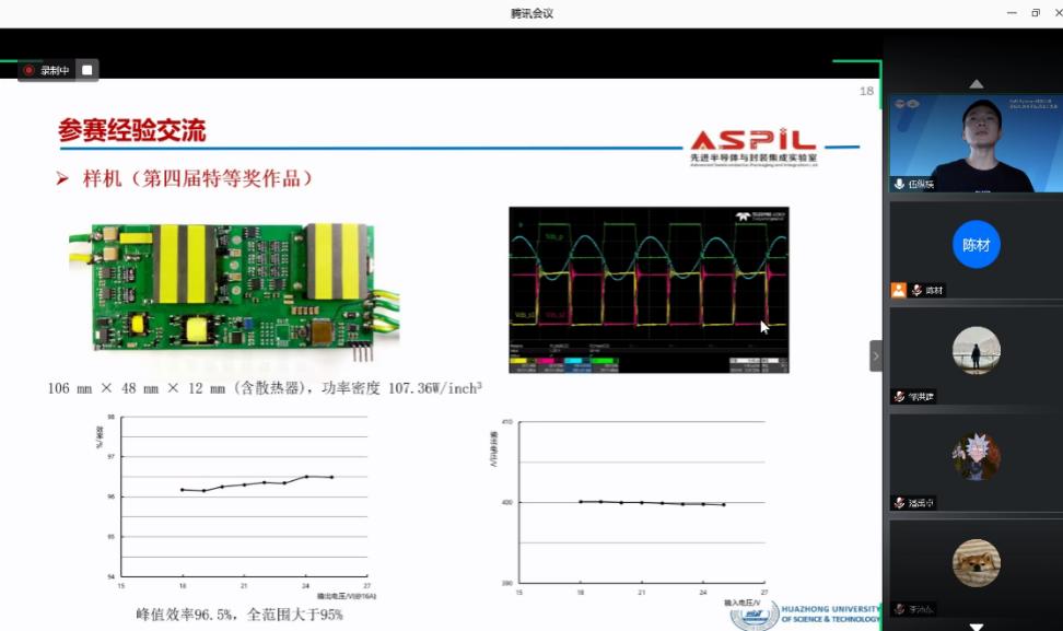 大赛启动仪式结束后,本届竞赛秘书处成员、NT动漫 陈材老师主持了大赛辅导说明会议,并代表组委会,对竞赛的题目技术要求、组织形式、时间节点、技术难点以及需要注意的问题进行了辅导与说明。往届获奖参赛队代表NT动漫 博士生伍纵横同学向本届参赛同学介绍了队伍组织、进度把控、现场调试等参赛经验。冠名赞助单位GaN Systems 公司和联合赞助单位宁波希磁电子科技有限公司在参赛辅导说明会上为各参赛队带来了专业的技术辅导,包括最新GaN器件的使用方法、相关性能以及行业前沿技术等,帮助参赛队更加顺利的完成竞赛作品设计工作。