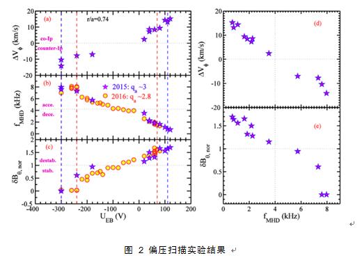 作者在文章中提出,撕裂模(TM)或新经典撕裂模(NTM)等宏观磁流体不稳定性会降低托卡马克等离子体的约束性能,甚至造成放电的终止。在实验中,通过将带偏压的石墨电极(偏压极性及大小相对于装置地而言)伸入到等离子体内部几厘米深的位置,发现负偏压对撕裂模存在置稳的作用,而正偏压对撕裂模存在解稳作用,如图1所示。通过偏压扫描实验发现,环向转动速度的变化量,2/1撕裂模的频率和磁扰动的幅度与偏压大小成线性关系。当偏压达到一定阈值时,可以完全抑制撕裂模(负偏压阈值)或发生锁模(正偏压阈值),并且偏压阈值与边界安全因子等因素有关,如图2所示。分析认为偏压电极会在电极所处位置和最外闭合磁面(限制器接地) 之间产生径向电流,从而产生环向和极向电磁力矩驱动等离子体旋转,影响撕裂模的频率和振幅。该实验研究为抑制撕裂模,缓解撕裂模锁模引起的等离子体破裂提供一种可能的途径。