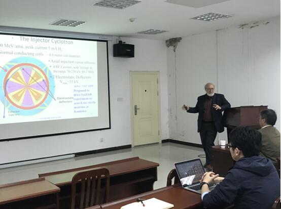 来访期间,Calabretta教授做了关于DAEδALUS强流质子回旋加速器介绍, DAEδALUS旨在利用高流强回旋加速器提供强中微子源,开展中微子相关的研究实验。它由800MeV 的DAEδALU超导回旋加速器和作为注入器的ISodAR 60MeV常导加速器组成,整体产生10mA质子束,超导加速器为6分离扇形环形回旋加速器,加速粒子种类为H2+离子。该方案结构紧凑,稳定性好,是目前先进的强流回旋加速器项目。