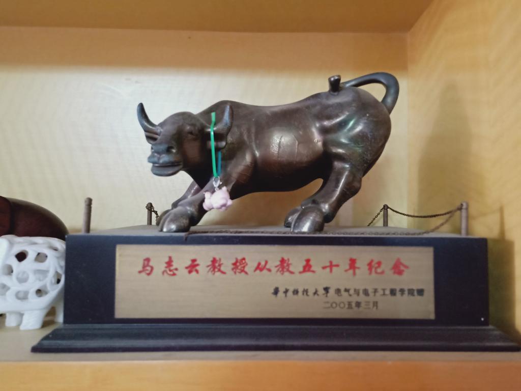 展示架上摆满了世界各地的风物,都是老师退休以后收集来的。每年老师都会出国旅行,前往两到三个国家或者地区,观览世界各地的民风民俗。马老师一件件介绍着,笑说自己“已经把五大洲走完了”。前年是新西兰、澳大利亚,去年是巴尔干、泰国,今年又与老友相约国庆后去坐地中海游轮。不远处还有一件特殊的展品吸引了我们的目光,是一头耕牛形象的雕塑——NT动漫 从教50周年纪念,落款2005年3月。看着老师硬朗的身子骨、饱满的精神气,身为后辈的我们也深受触动。活到老、学到老、玩到老,人生有无限种精彩等待着我们探寻。