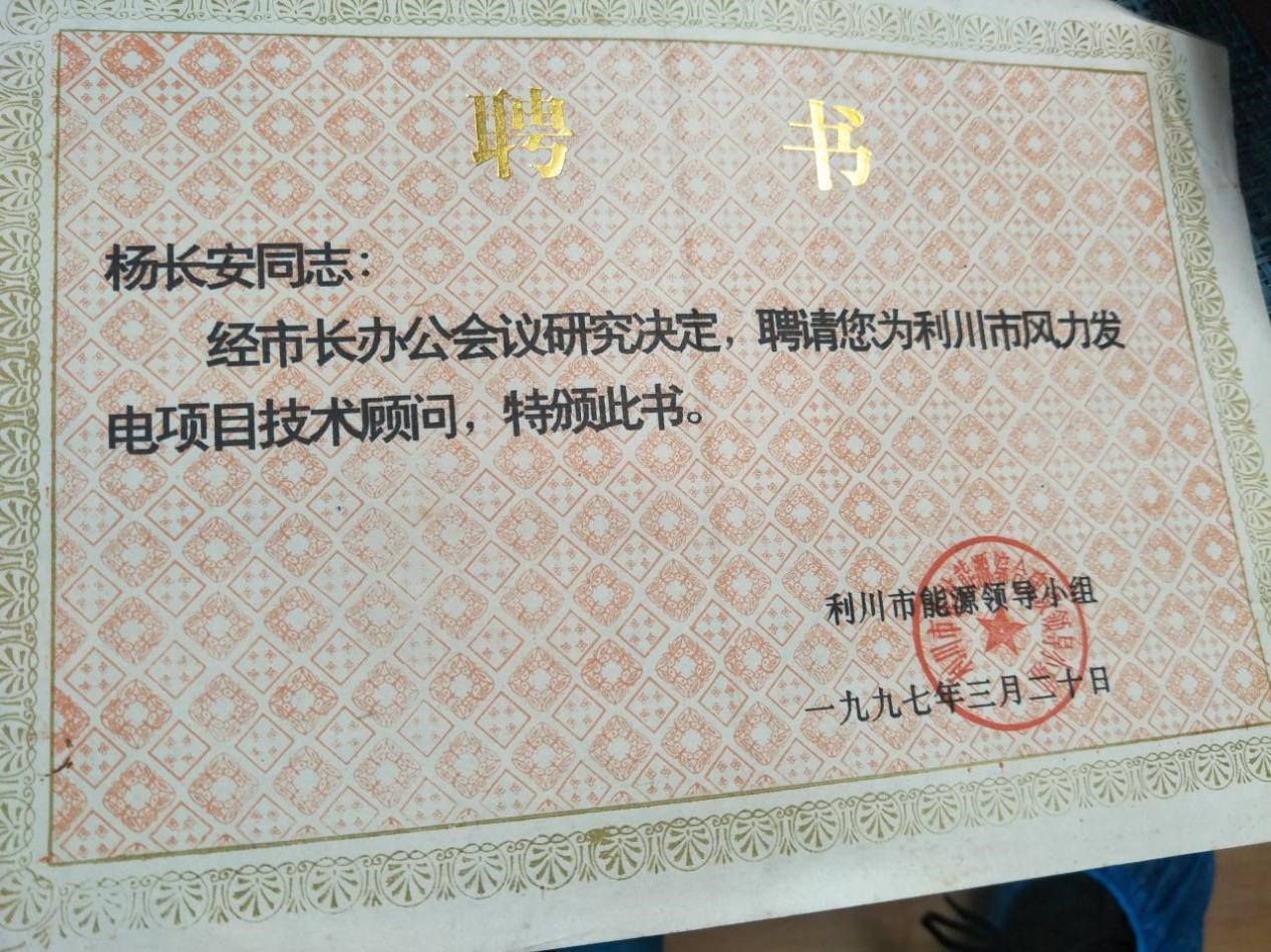 杨长安老师曾获各项专业领域证书,包括聘请他为利川市风力发电项目技术顾问的聘书;被授予湖北省电机工程学会积极分子荣誉称号的荣誉证书;被推荐为先进个人的先进个人推荐书;被聘请为湖北省电机工程学会风力发电专业委员会主任委员的聘书;社会团体分支(代表)机构的登记证书;被华中理工大学授予的从事教育工作三十年的荣誉证书等等。此外,他还主要负责了一个武汉市科技计划项目——“武汉(木兰湖)、湖北省地区风力发电构想”。杨长安老师,人称“杨风电”,不愧为是湖北省风力发电的奠基人和开拓者。