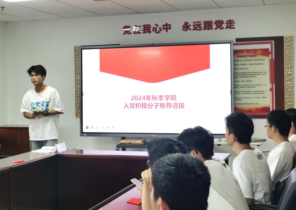 会上进行了入党积极分子推荐选拔。该项工作由2408班团支书欧阳子豪同志主持,梁召榜、董天昊、李逸、耿玉英、王旭龙、莫开寅、祝诗凯参与自我推荐。梁召榜在发言中表示:父亲是共产党员,他为人民服务的身姿从小就对我产生了耳濡目染的影响,我希望能像他一样成为一个光荣的共产党员。我有为同学服务的愿望,希望能投身于为人民服务的光荣事业中去,积极参与学生事务,为同学们谋福祉;我将坚守党的宗旨,投身于学生工作中去。”