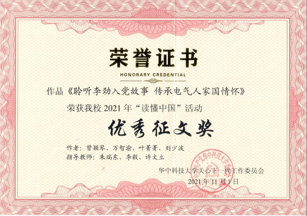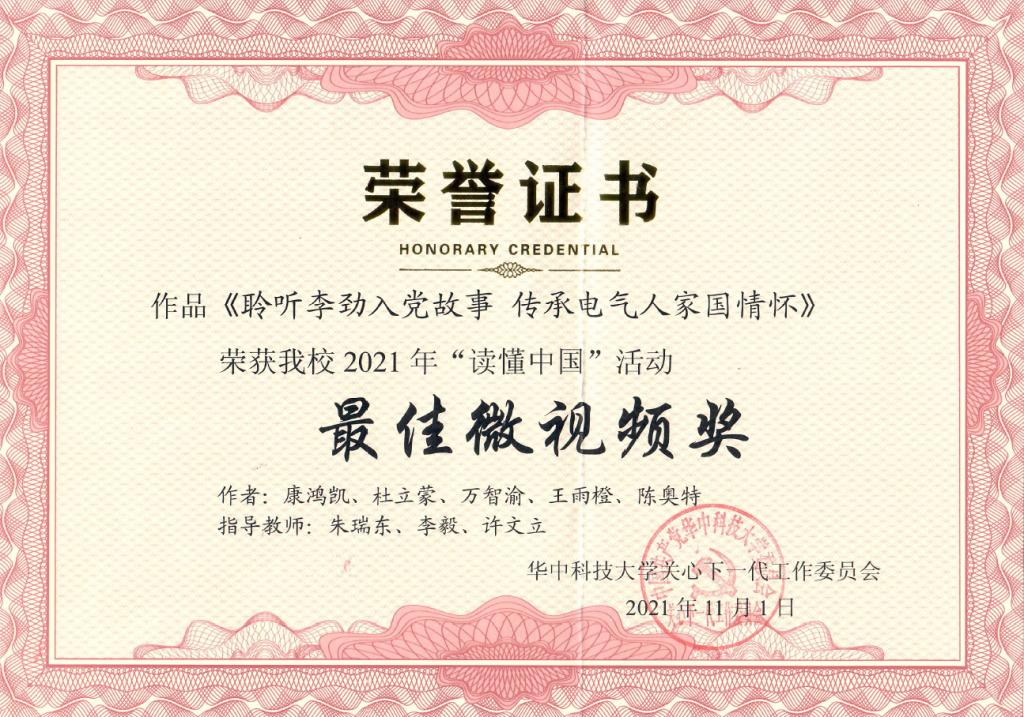 2021年11月1日,NT动漫 关工委在老年活动中心举行“讲好入党故事——传承红色基因”——2021年“读懂中国”活动颁奖仪式暨作品展演。电气博士2002班党支部作品《聆听李劲入党故事,传承电气人家国情怀》荣获“最佳微视频奖”(作者:康鸿凯、杜立蒙、万智渝、王雨橙、陈奥特,指导教师:朱瑞东、李毅、许文立)和“优秀征文奖”(作者:曾颖琴、万智渝、叶菁菁、刘少波,指导教师:朱瑞东、李毅、许文立)。NT动漫 荣获“优秀组织奖”。